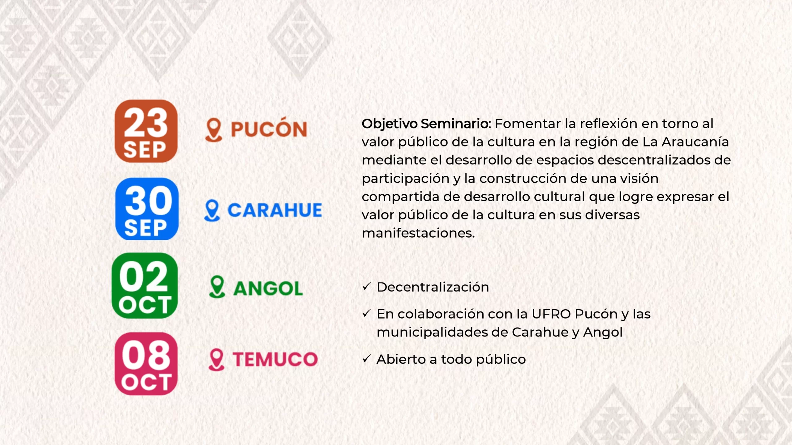 Su primera edición fue en el año 2016 en torno a la temática “Referentes para la planificación en cultura”; durante el año 2017 su modalidad fue un coloquio en torno “Políticas Culturales y Transformación Social”, en 2018 el seminario se tituló “Miradas para la comprensión de lo cultural“, en su versión 2019 el tema fue “Desarrollo sostenible y participación ciudadana”, durante la pandemia se produjo una pausa que se reactivó en 2022 con la versión denominada “Interculturalidad y Memoria en el debate público de la Araucanía”, y su última versión 2024 denominado “Territorio de creadoras y creadores”.