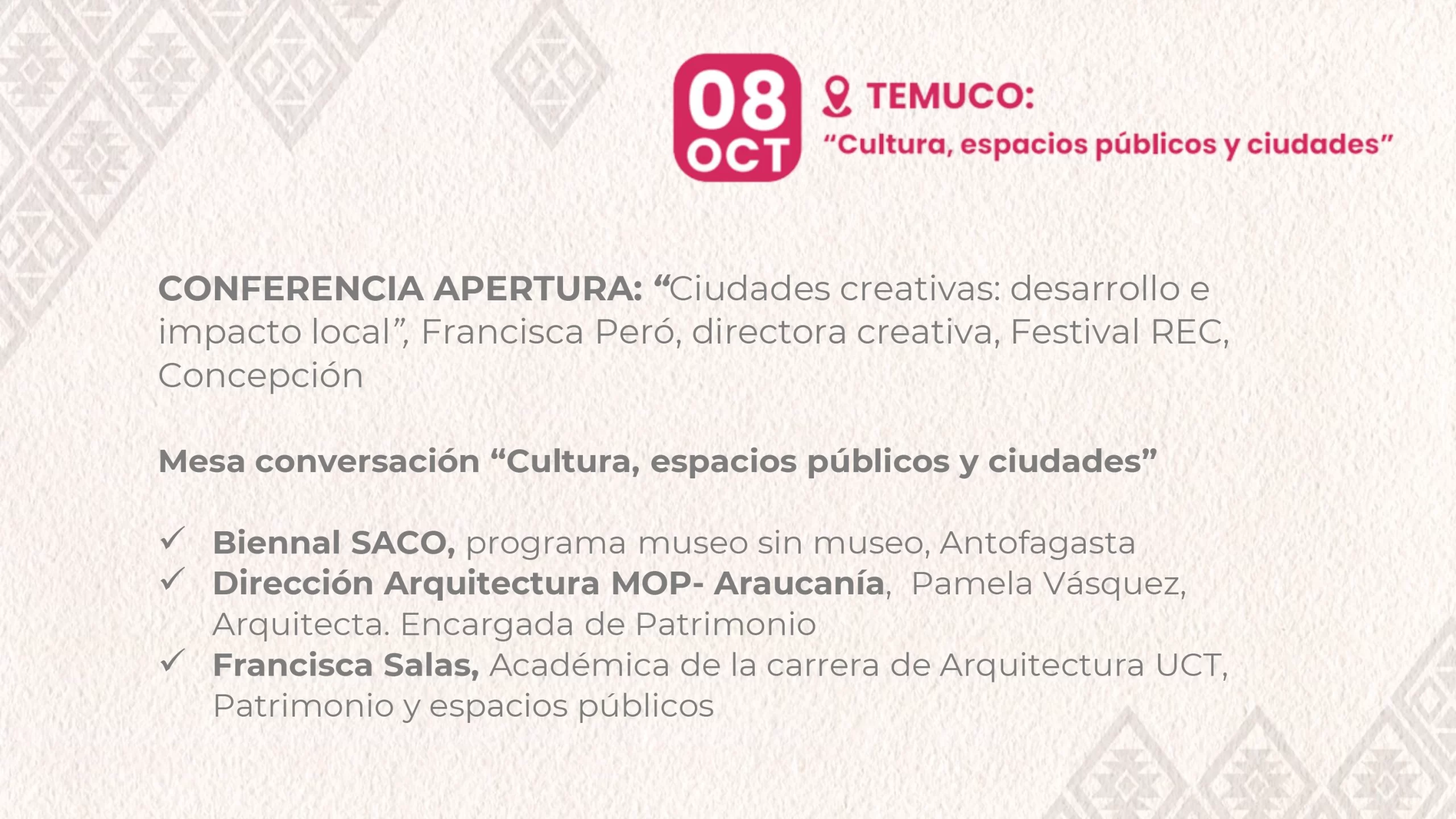 4. El valor de la cultura en el habitar de las colectivas humanas, en ciudades y pueblos de La Araucanía, donde emerge la interrogante por los beneficios y desafíos del vínculo entre arte y espacio público, para la experiencia social y estética de la población y la consolidación de múltiples imaginarios en contextos multiculturales e interculturales.