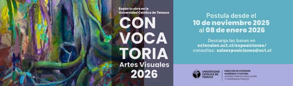La Universidad Católica de Temuco invita a artistas, creadora/es y autora/es visuales a postular sus proyectos expositivos para formar parte del programa anual de exposiciones 2026. Esta iniciativa busca difundir y poner en valor la producción artística regional, promoviendo el diálogo entre arte, territorio y comunidad.