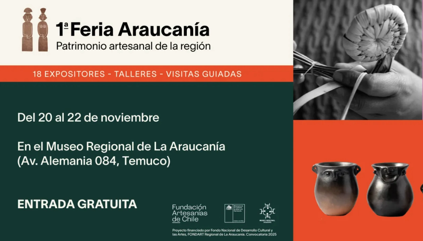 Este 20, 21 y 22 de noviembre, la 1° Feria Araucanía reunirá en el Museo Regional de La Araucanía a 18 agrupaciones de destacadas cultoras y cultores: 14 de La Araucanía, 2 de Los Ríos y 2 Los Lagos, dando vida a un nuevo espacio de comercialización, difusión y puesta en valor del patrimonio artesanal del territorio sur, que busca potenciar la asociatividad entre cultoras y cultores. Este proyecto es financiado por el Fondo Nacional de Desarrollo Cultural, Fondart Regional de La Araucanía. Convocatoria 2025.